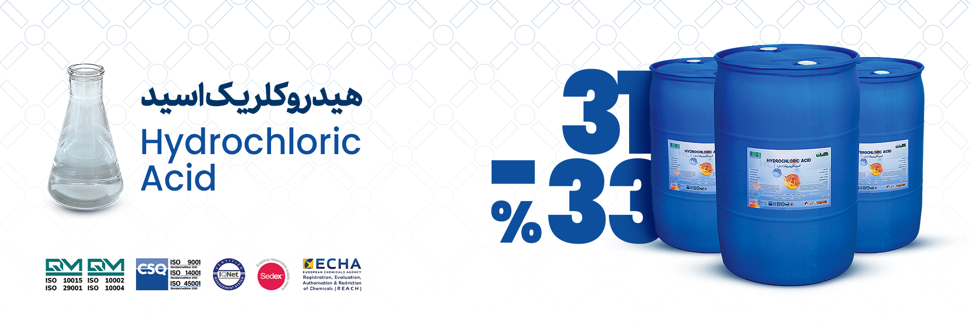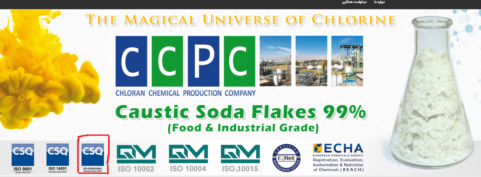 شرکت کلران تولید کننده کلر و مشتقات آن : گاز کلر - هیپوکلریت سدیم (آب ژاول) -هیپوکلریت کلسیم - کاستیک سودا - اسید کلرئیدریک -کلسیم کلراید. کلر مایع 45 کیلوگرمی - واحد سیلندر درصد خلوص: 99.5 %نوع بسته بندی: سیلندر 45 کیلوییواحد: کیلو گرم قیمت درب کارخانه در سیلندر مشتری ۱۰,۰۰۰ تومان اطلاعات بیشتر کلر مایع 800 کیلوگرمی درصد خلوص: 99.5 %نوع بسته بندی: سیلندر 800 کیلوییواحد: کیلو گرم قیمت درب کارخانه ۸,۰۰۰ تومان اطلاعات بیشتر هیپوکلریت سدیم(آبژاول) حمل با تانکر درصد خلوص: 15- 16%نوع بسته بندی: تانکرواحد: کیلو گرم قیمت درب کارخانه ۱۵,۰۰۰ تومان اطلاعات بیشتر اسید کلریدریک حمل با تانکر درصد خلوص: بر مبنای 31/33% نوع بسته بندی: تانکرواحد: کیلوگرمقیمت: درب کارخانه ۲,۹۷۰ تومان اطلاعات بیشتر هیدروکسید سدیم (سود مایع) حمل با تانکر درصد خلوص:48-50%نوع بسته بندی: تانکرواحد: کیلوگرمقیمت درب کارخانه info@ccpc.ir ۲۱,۵۰۰ تومان اطلاعات بیشتر هیدروکسید سدیم (سود پرک) درصد خلوص:حداقل 98% نوع بسته بندی در کیسه 25 کیلویی واحد : کیلو گرمقیمت درب کارخانه info@ccpc.ir ۵۰,۰۰۰ تومان اطلاعات بیشتر هیپوکلریت کلسیم(پرکلرین) 25 کیلوگرمی 70- 65 % درصد خلوص:70- 65 %نوع بسته بندی: بشکه 25 کیلوییواحد:کیلو گرم قیمت درب کارخانه ۱۱۰,۰۰۰ تومان اطلاعات بیشتر کلسیم کلراید جامبو یک تنی درصد خلوص:94-96%نوع بسته بندی: کیسه جامبو یک تنی واحد: کیلو گرمقیمت درب کارخانه ۱۴,۳۰۰ تومان اطلاعات بیشتر کلسیم کلراید کیسه 25 کیلویی درصد خلوص:94-96%نوع بسته بندی: کیسه 25 کیلویی واحد: کیلو گرمقیمت درب کارخانه ۱۷,۰۰۰ تومان اطلاعات بیشتر کلسیم کلراید مایع درصد خلوص-36%نوع بسته بندی: واحد: کیلوگرمقیمت درب کارخانه ۲,۹۷۰ تومان اطلاعات بیشتر هیپوکلریت کلسیم (پرکلرین)%60 40 کیلوگرمی درصد خلوص: 60%نوع بسته بندی: بشکه40 کیلوییواحد: کیلو گرم قیمت درب کارخانه ۵۵,۰۰۰ تومان اطلاعات بیشتر AddToCartModal × به سبد خرید شما افزوده شد. مشتریان